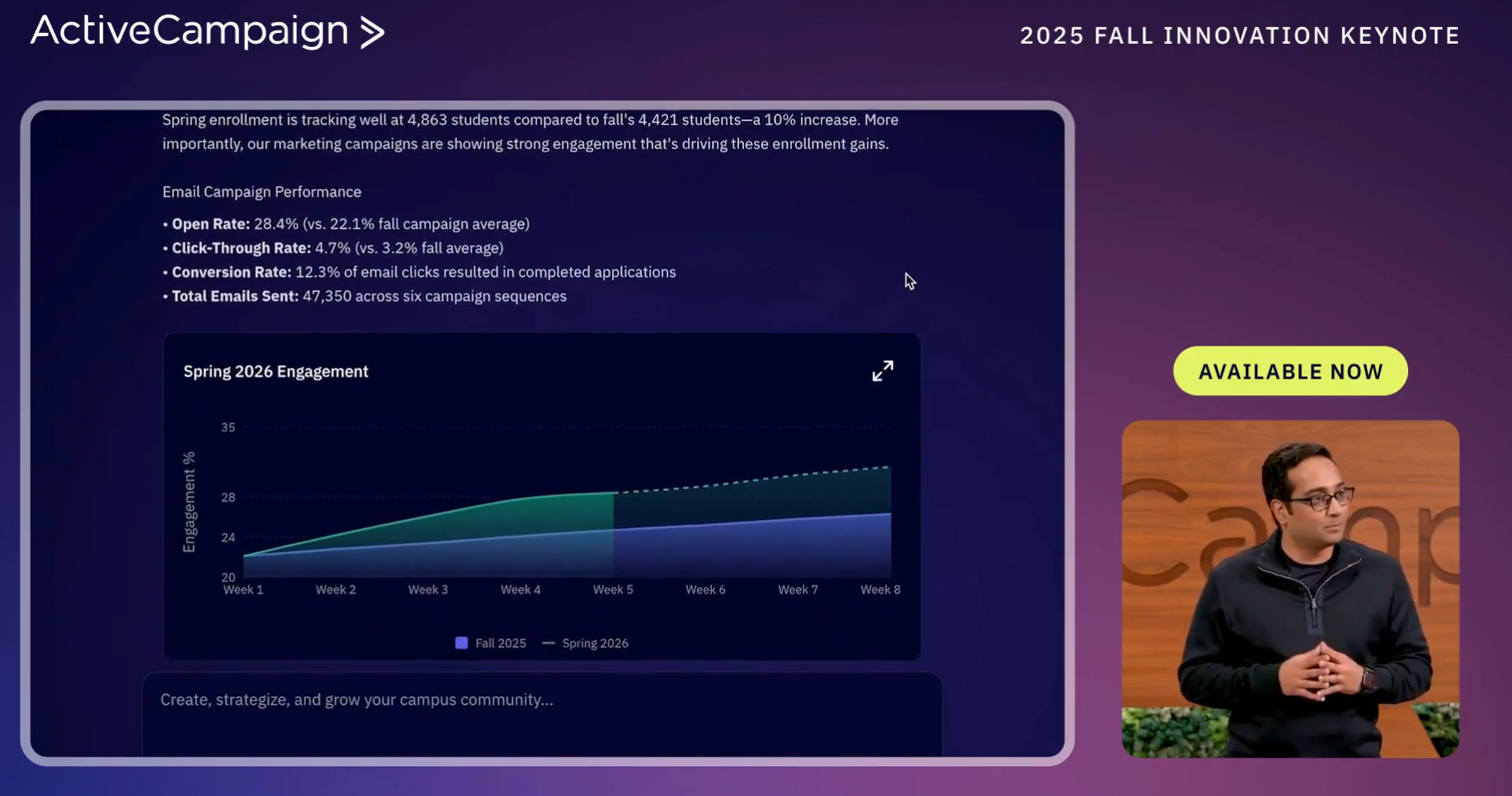 Nach rund zwei Minuten geht auf die Frühjahrs Keynote ein und blickt noch einmal auf die Einführung von ActiveIntelligence zurück. Mittlerweile nutzen tausende Konten die Funktion als Unterstützung. ActiveIntelligence wird von den Bestandskunden sehr gut angenommen. Sie benutzen ActiveAI nicht nur, sondern sie erhalten damit ausgezeichnete Ergebnisse.