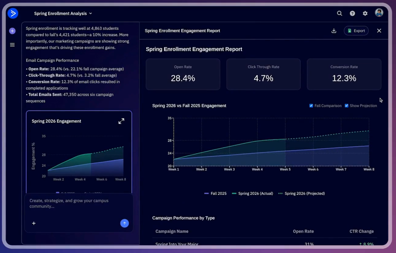 So fragt er zunächst ab, wie der Trend von E-Mail Abos im Frühling war ("How is my spring enrollment trending?").