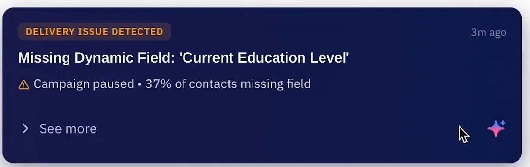 Doch auch, wenn die KI nicht aktiv ist, ist sie präsent. Als kleine Kästchen in deinem ActiveCampaign-Account. So zeigt dir ein AI-Agent beispielsweise Auslieferungsschwierigkeiten an.
